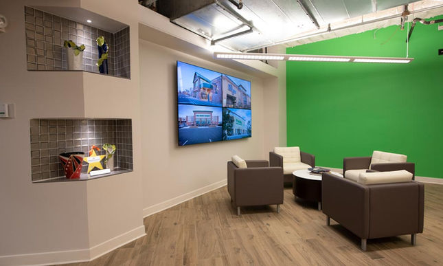 The building features a dramatic three-story atrium in both towers with stunning marble floors and walls. Spaces feature a glass entrance showcasing an open and inviting environment.
